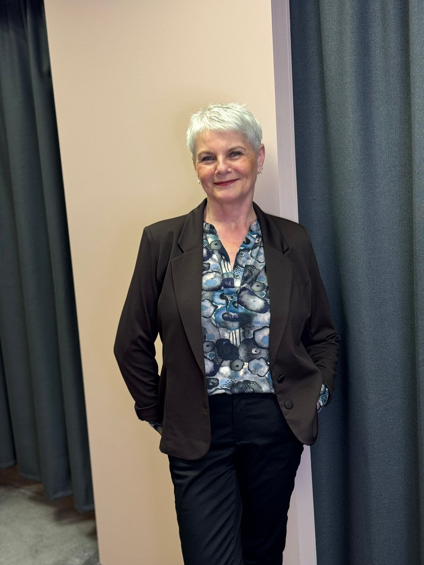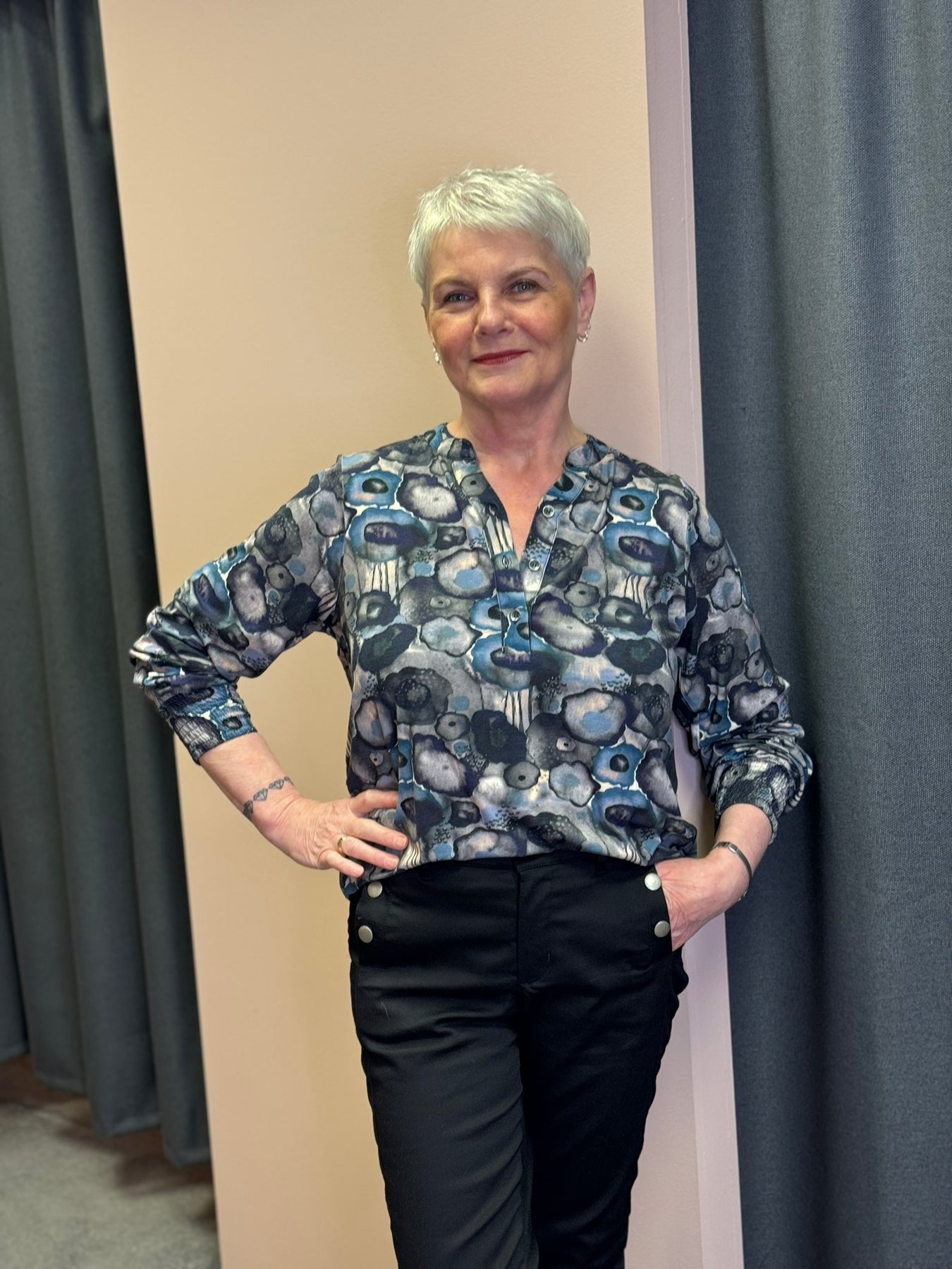 Jerseybluse med stolpelukning, knapper og smockmanchetter.