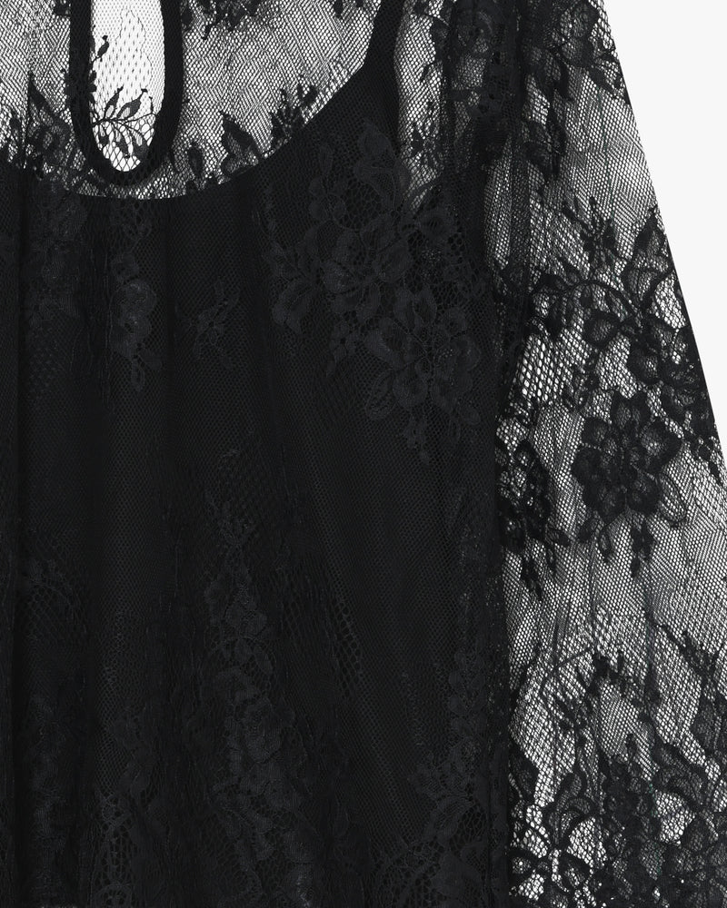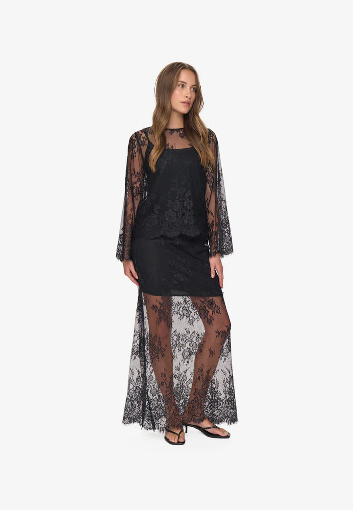 Aviaia er en feminin og elegant langærmet bluse med bådudskæring og en smuk, let gennemsigtig blonde. Blusen har en løs pasform, der falder blødt og behageligt, og de lange ærmer med let vidde giver et luftigt og stilfuldt udtryk. Bagpå er der en diskret åbning i nakken med knaplukning.Blusen leveres med en matchende singlet.
