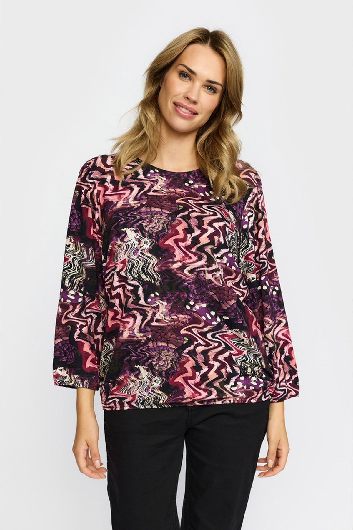 Stilfuld mønstret top fra 2-Biz, model Tandy i blå og grå. Rund halsudskæring og lige model med elastik forneden. Trekvartærmer med elastik. Match med et par smarte jeans. PASFORM • Normal, vi anbefaler at du vælger din sædvanlige størrelse.