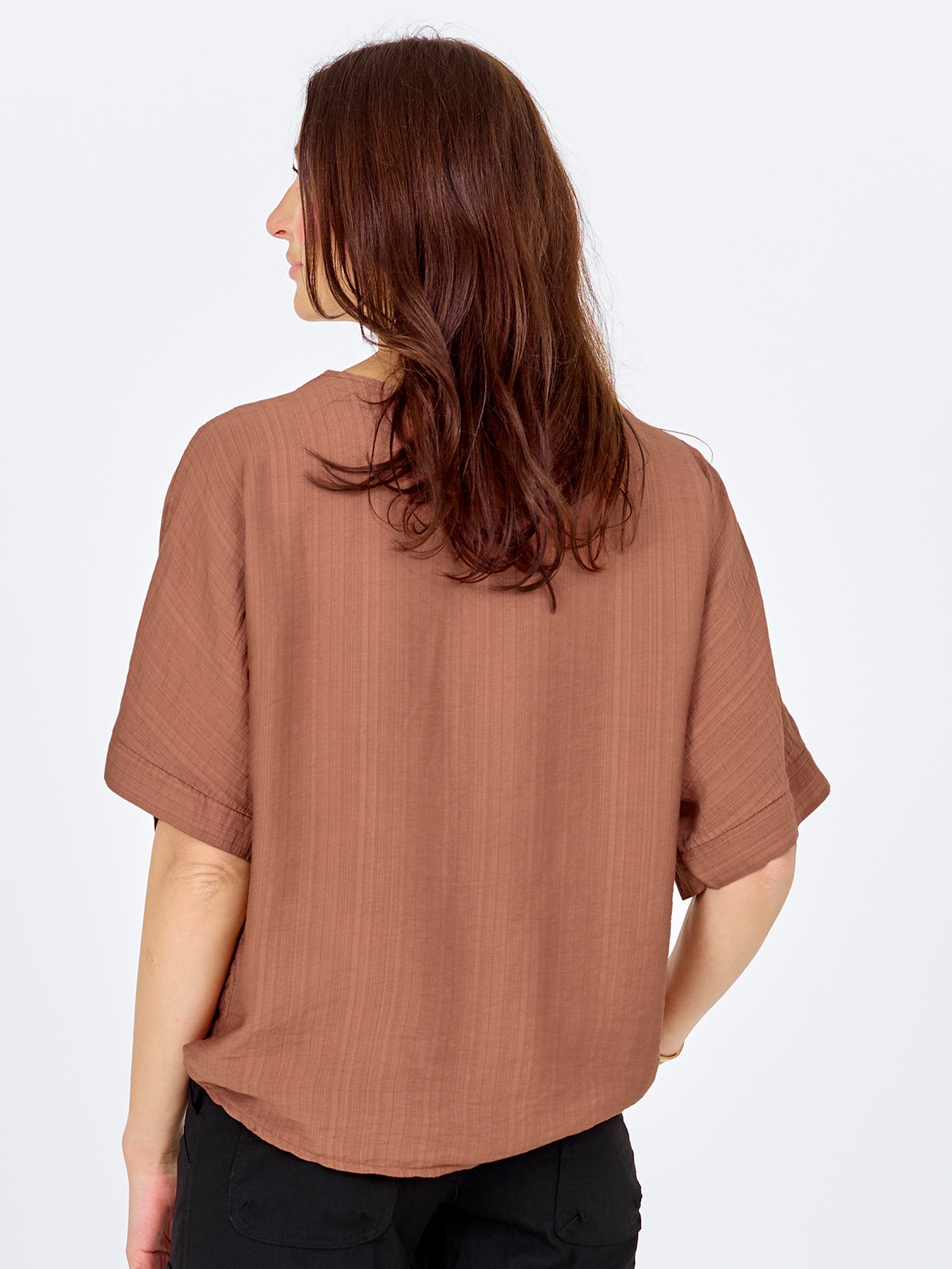 Denne luftige bluse forener komfort og enkelthed med sit let strukturerede materiale og afslappede pasform. Den har korte, løstsiddende ærmer og en V-udskæring med en dekorativ fold foran, som tilføjer et blødt fokuspunkt til designet. Den brede ærmekant giver blusen et let løft og afrunder det afslappede look.
