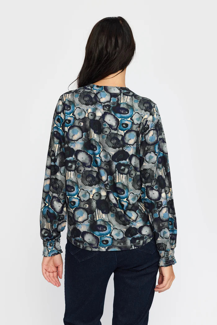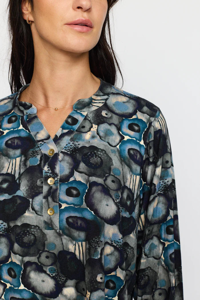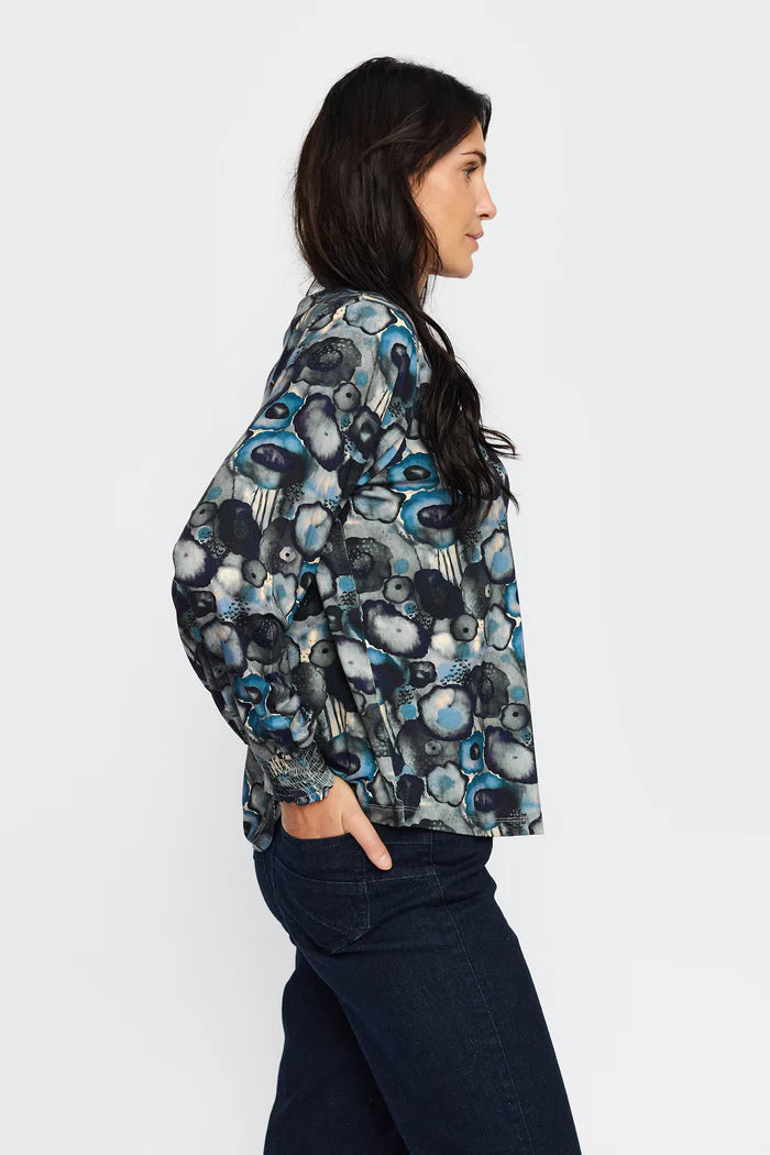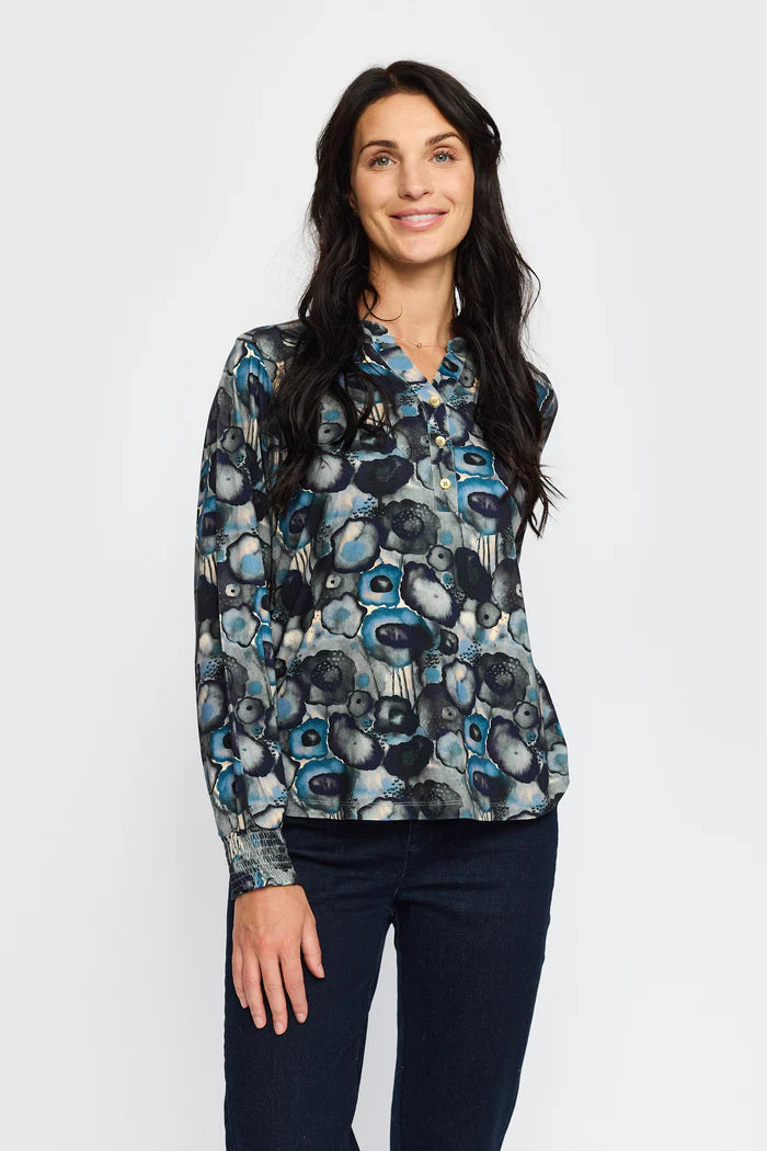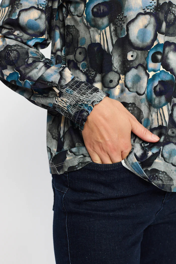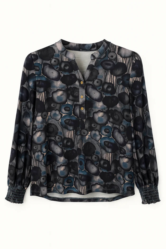 Jerseybluse med stolpelukning, knapper og smockmanchetter.