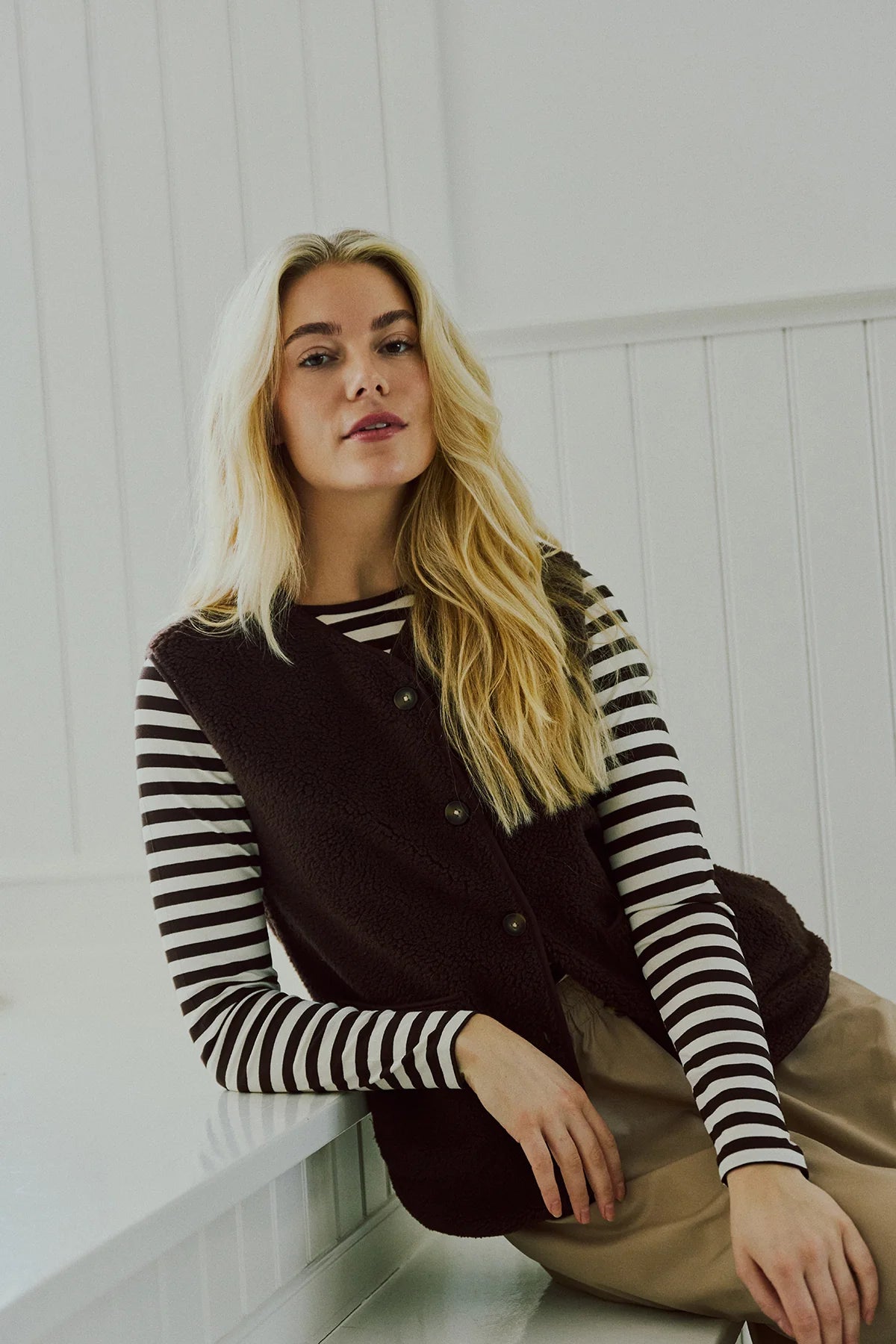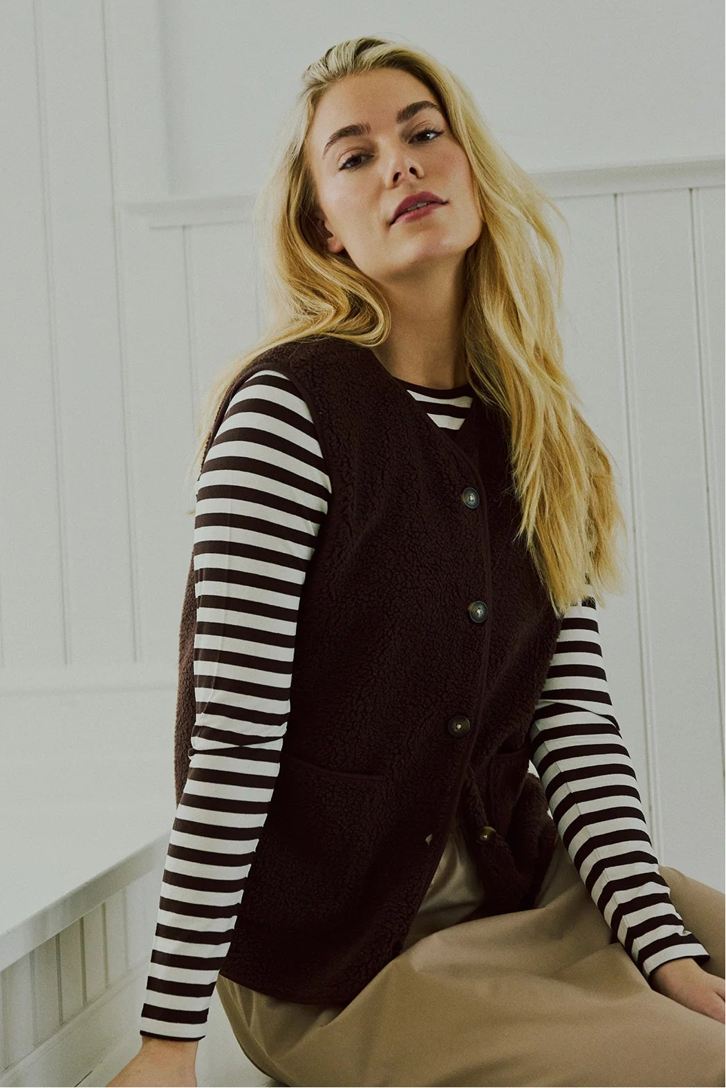 Vest fra Freequent i en blød teddybear-kvalitet. Vesten er enkel i modellen med store frontlommer samt hornknapper på fronten.