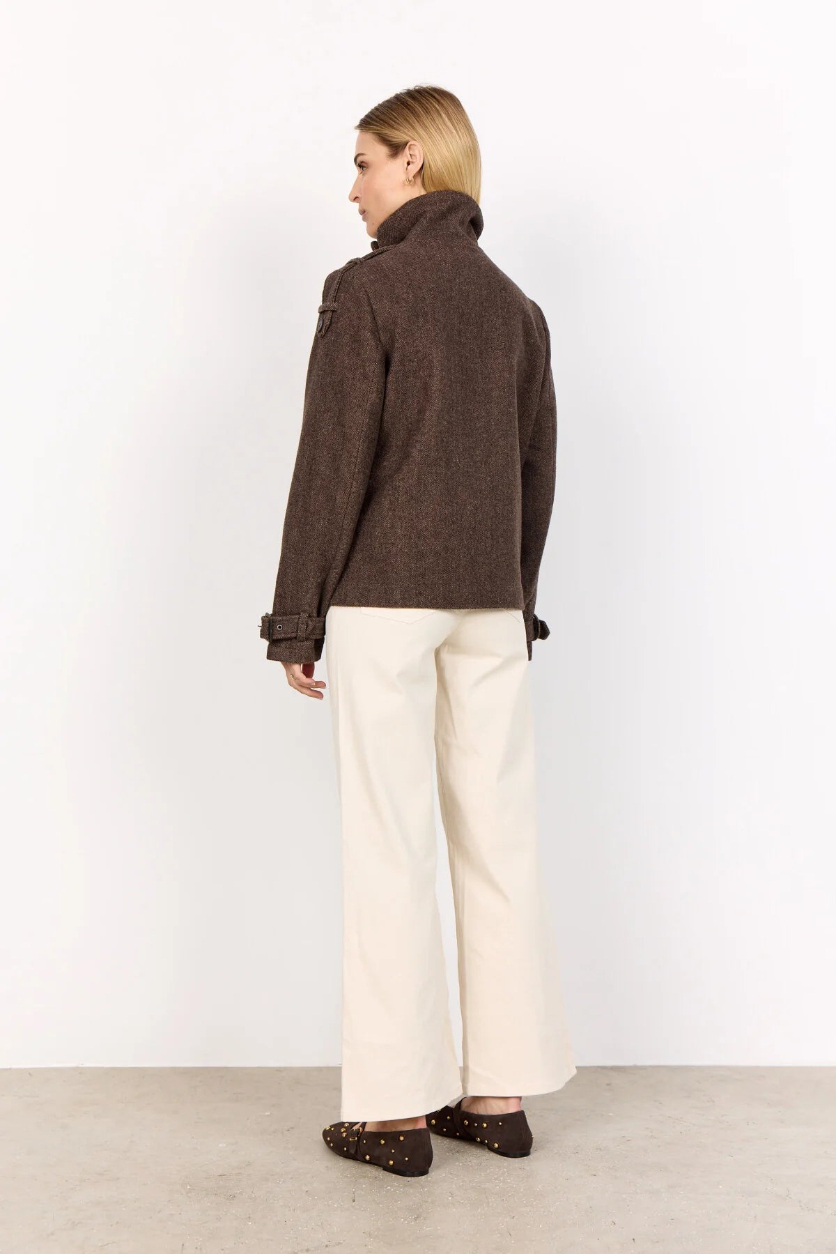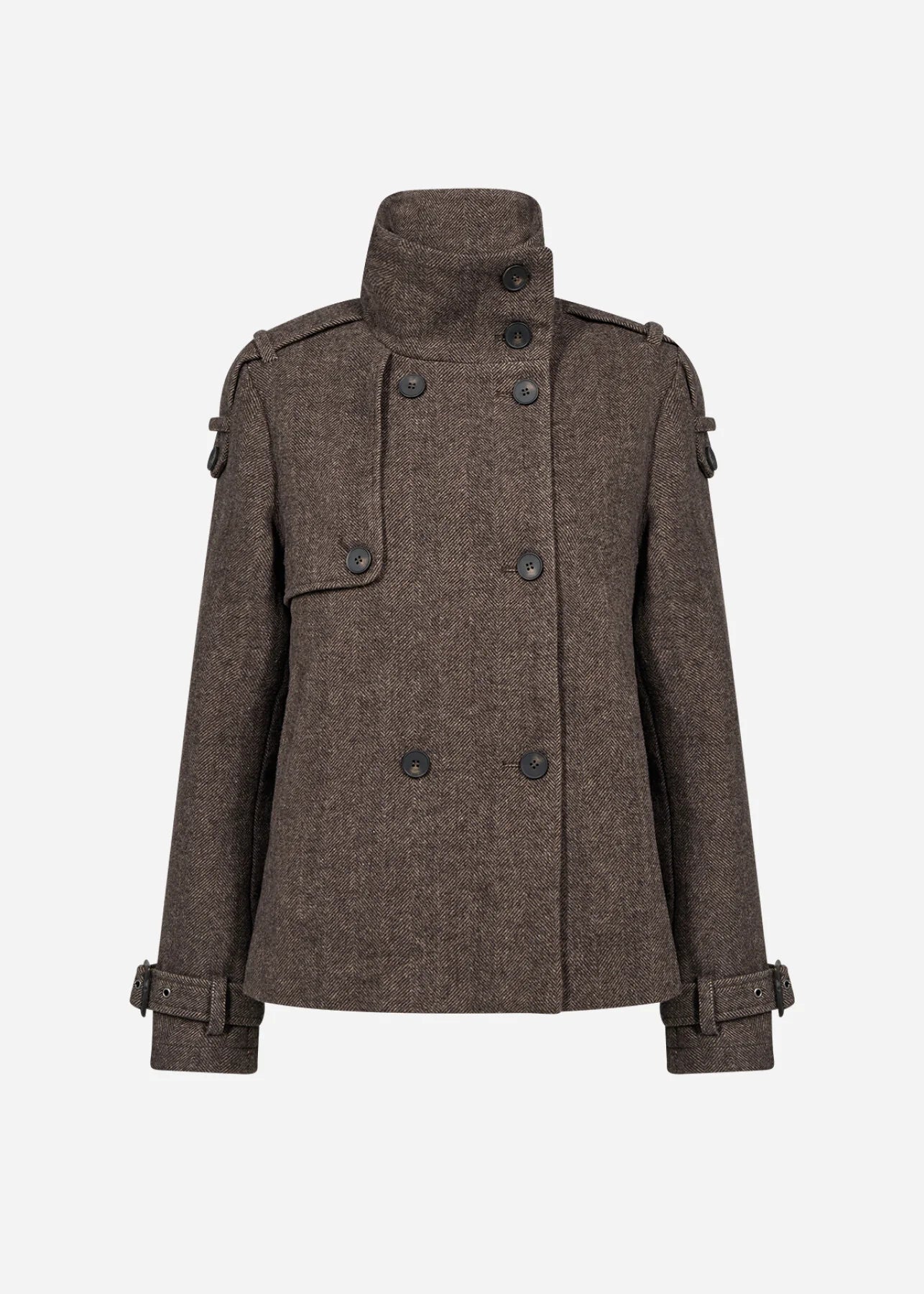 SC-SHAKIRA 1 er en jakke fremstillet af 60% polyester, 32% uld og 8% akryl. Jakken har en høj krave, knapdetaljer og en sildebensstruktur. Sæt den sammen med skræddersyede bukser eller dine yndlingsjeans for et gennemført look.