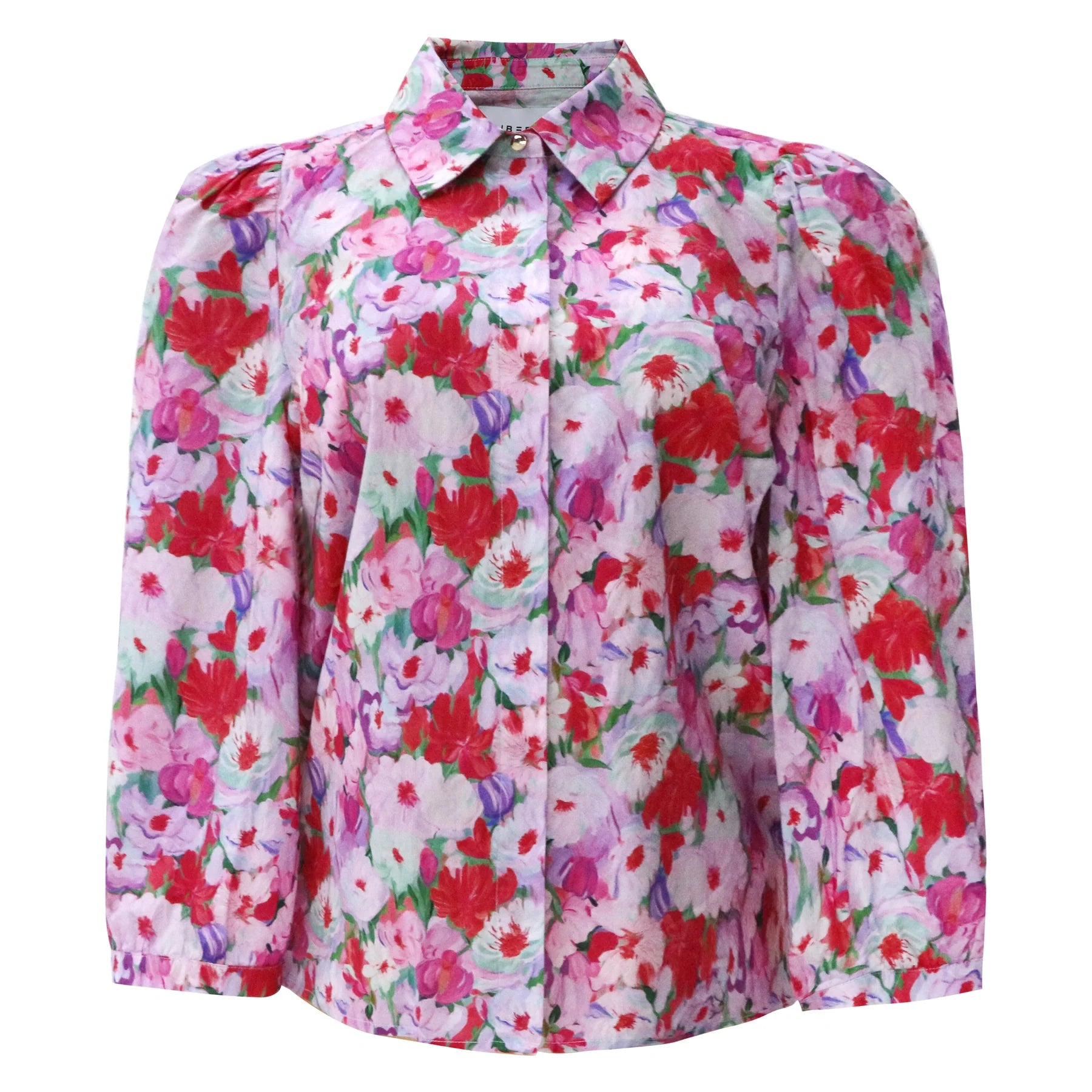 Bluse fra Liberte med et blomsterprint i pink, røde og grønne nuancer. Blusen har en skjortekrave og pufærmer med blondedetaljer.
