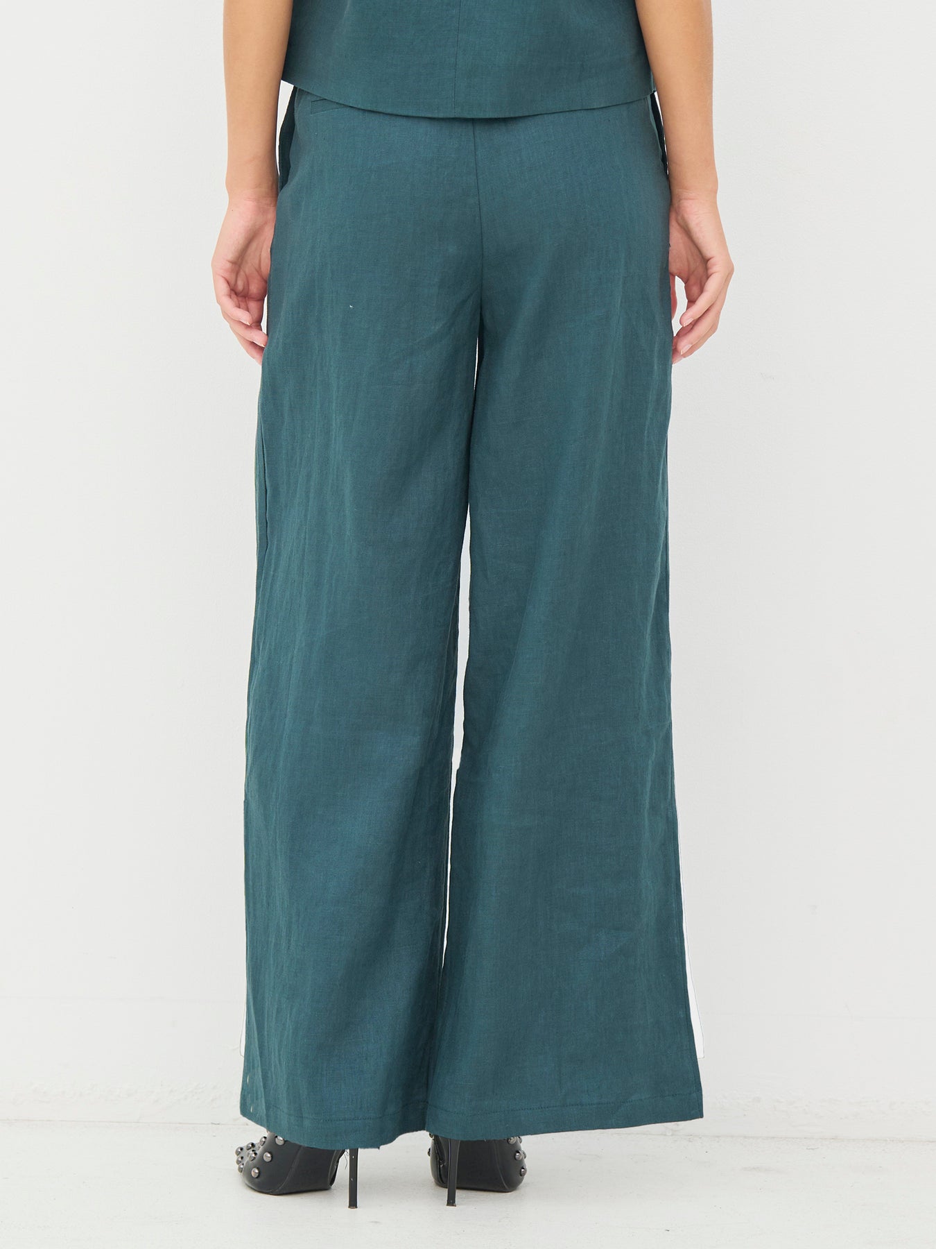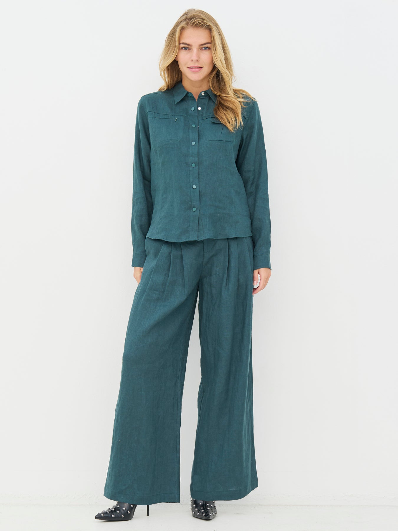 Disse bukser er lavet i 100% hør og har en lige pasform med brede ben, som giver et let og elegant fald. Foran har de fine læg, der skaber form og giver bukserne lidt ekstra vidde, mens de bagpå er mere enkle i udtrykket. Hørkvaliteten gør bukserne behagelige at have på og velegnede til både varme dage og mere sammensatte looks.