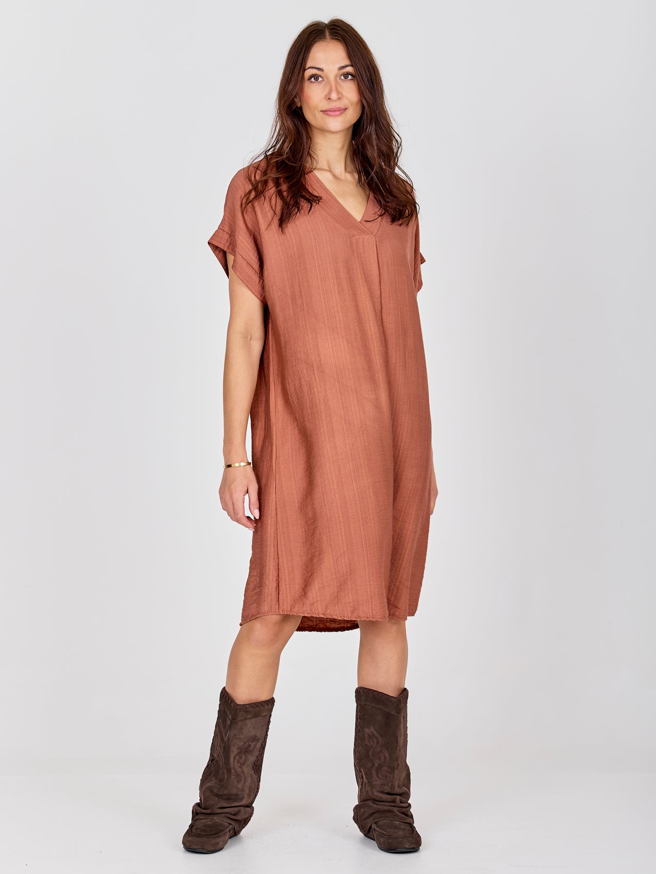 Denne tunika har et afslappet og enkelt look med en lige pasform, der falder blødt ned langs kroppen. Den elegante V-hals skaber et åbent og luftigt udseende, mens de korte ærmer holder silhuetten enkel og alsidig. Længden gør den behagelig at have på hele dagen og nem at style, enten alene som kjole eller med flade sko og accessories for et mere afslappet look.