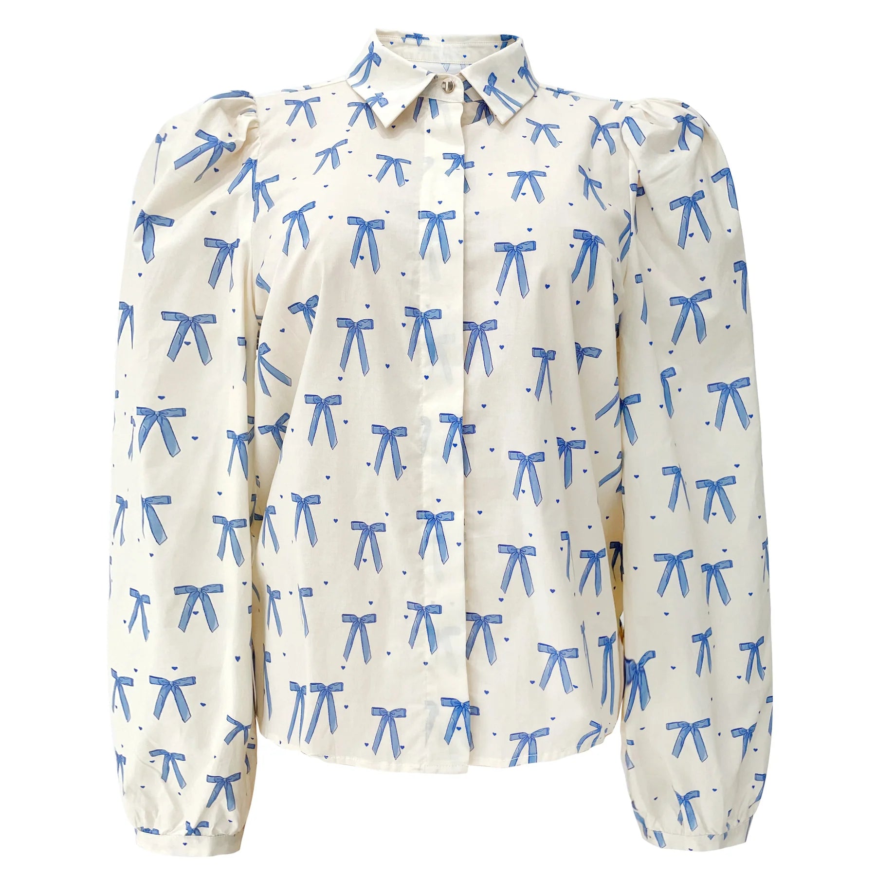 Let bluse i cremefarvet print med små blå sløjfer og prikker. Designet med pufærmer og klassisk krave for et feminint og frisk udtryk.