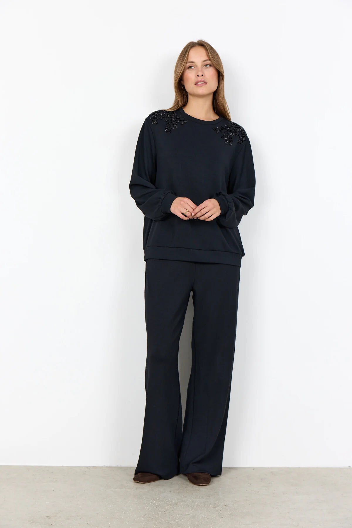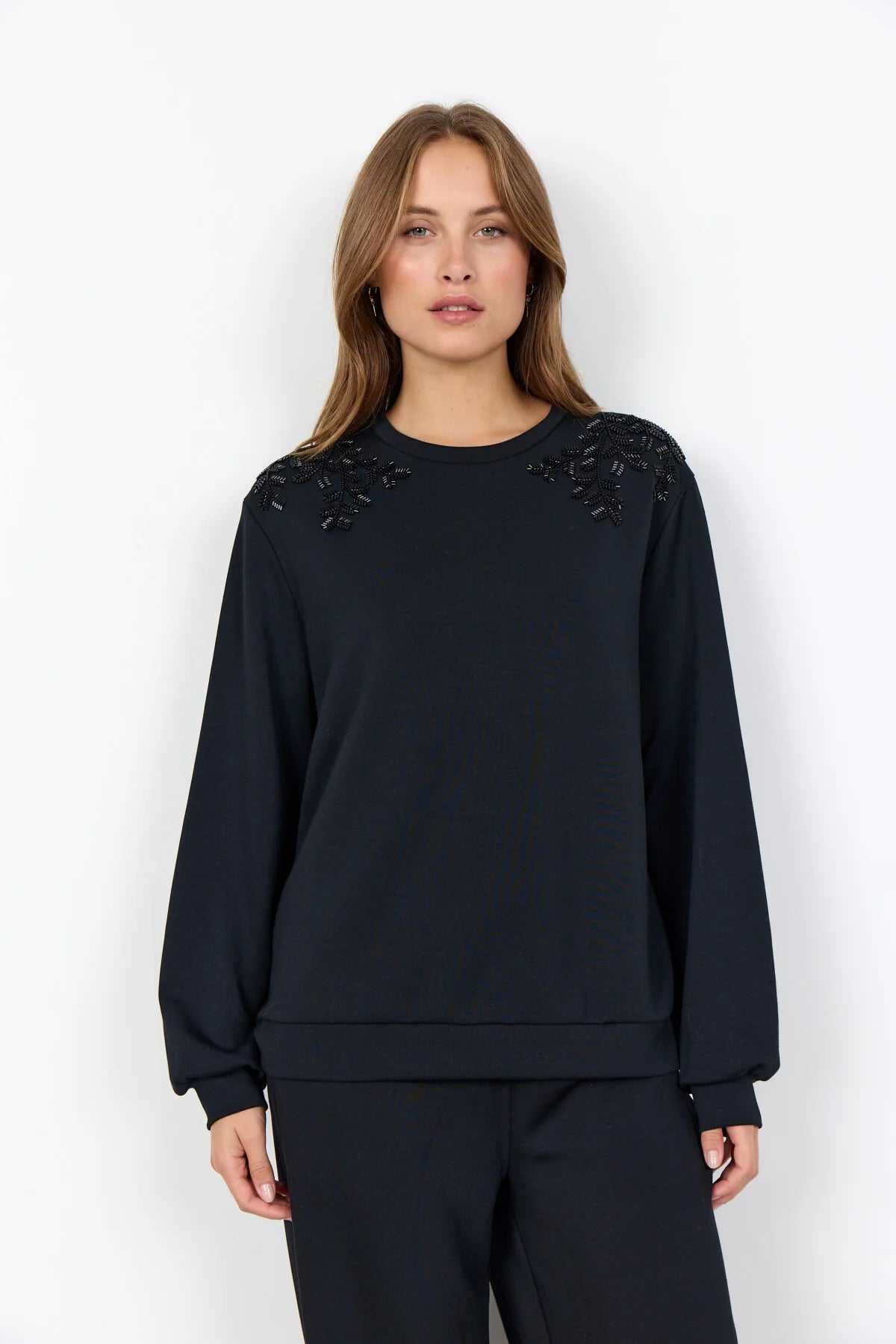 BANU 269 er en bluse fremstillet af 48 % modal, 48 % polyester og 4 % elastan. Den har elegante broderidetaljer på skuldrene, en rund halsudskæring og ribbede manchetter for en behagelig pasform. Sæt den sammen med dine yndlingsjeans eller en elegant nederdel for et stilfuldt outfit.