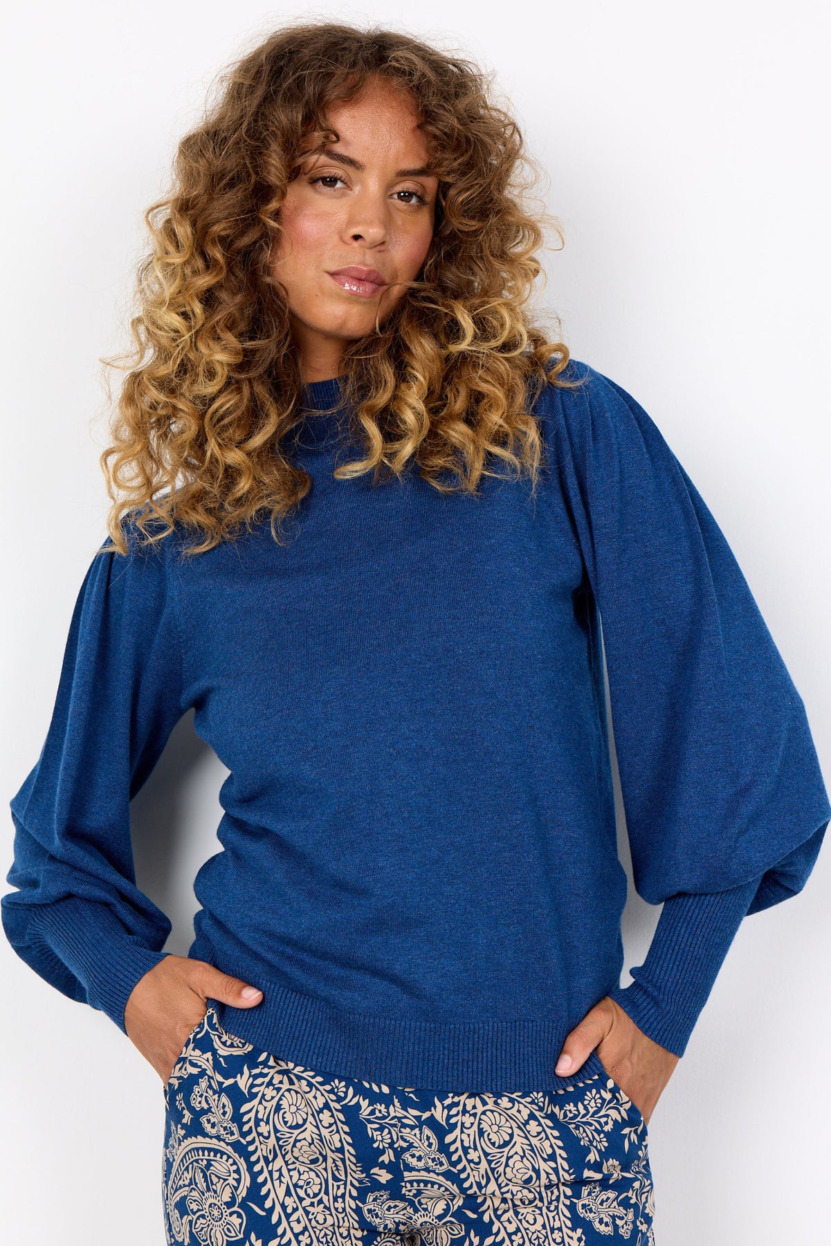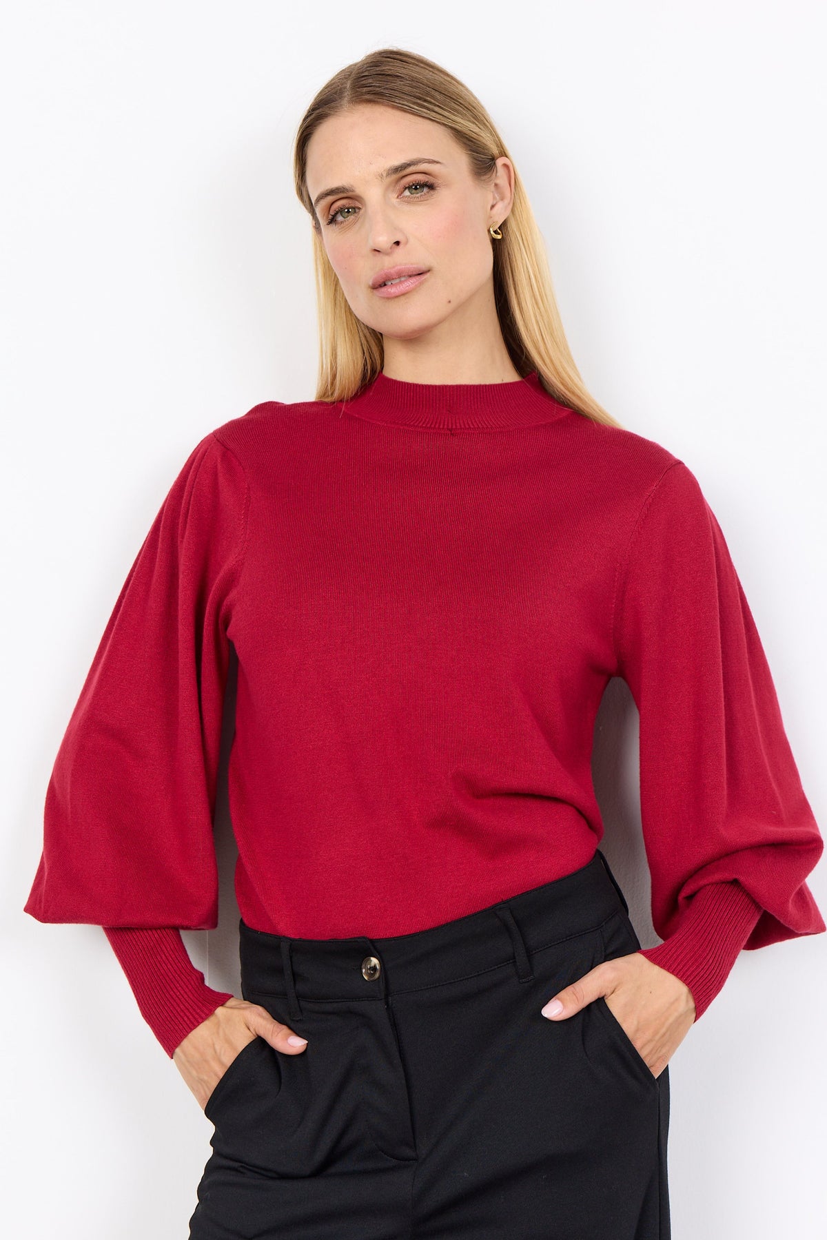 SC-Dollie 666 er en klassisk pullover i en viskose og nylon blandingskvalitet. Pulloveren er i et rib strikket materiale, har en høj hals, lange puff ærmer og en komfortabel pasform. Dette er en perfekt style under en vest eller med en blazer.