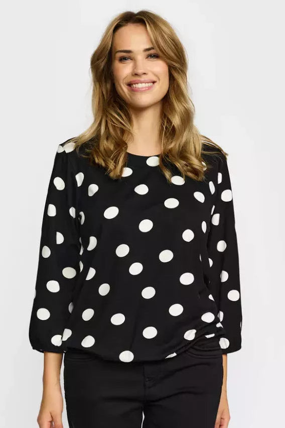 Stilfuld mønstret top fra 2-Biz, model Tandy i blå og grå. Rund halsudskæring og lige model med elastik forneden. Trekvartærmer med elastik. Match med et par smarte jeans. PASFORM • Normal, vi anbefaler at du vælger din sædvanlige størrelse.